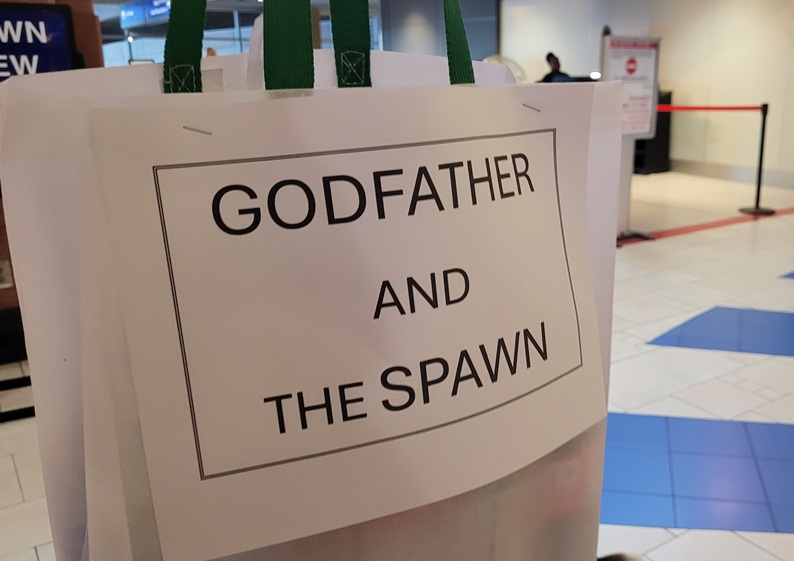 While Joe and Adam were on their flight to Phoenix, I assembled a tote bag of their goodies and stapled a sign to it that said, “Godfather and the Spawn,” like it was the name of a rock band. I felt like I was on a mission. With the tote bag in one hand, and Lucy’s leash in the other, we headed to the airport and positioned ourselves just beyond security.